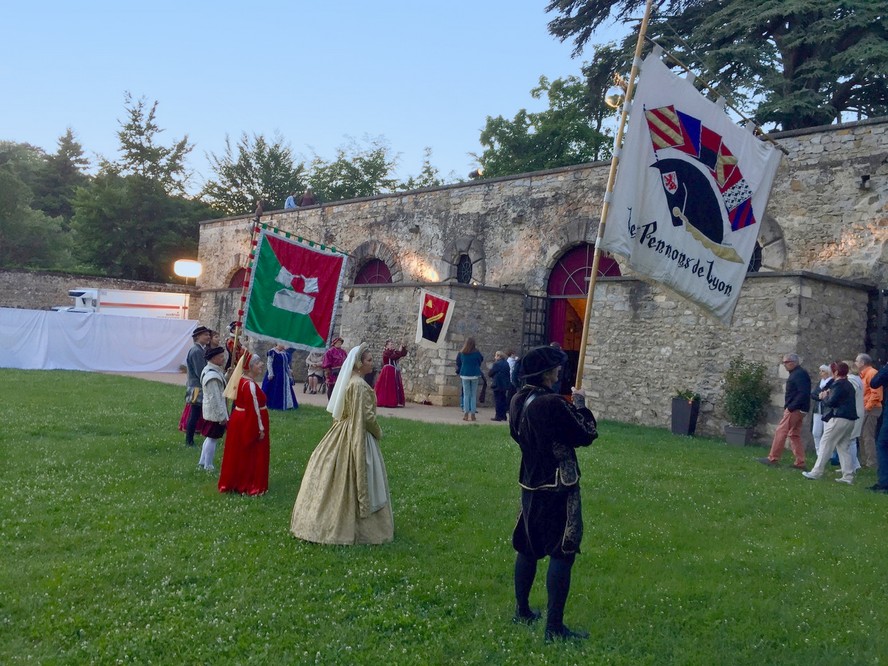 Le samedi 20 mai 2017, les Pennons de Lyon ont animé le festin organisé à l’Orangerie du Parc de Beauregard à Saint Genis-Laval (Rhône), ancienne résidence d’été de la riche famille des Gadagne, banquiers italiens établis à Lyon au XVIe siècle.