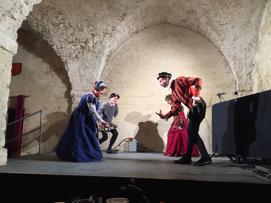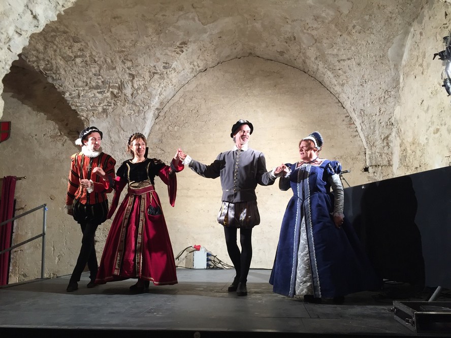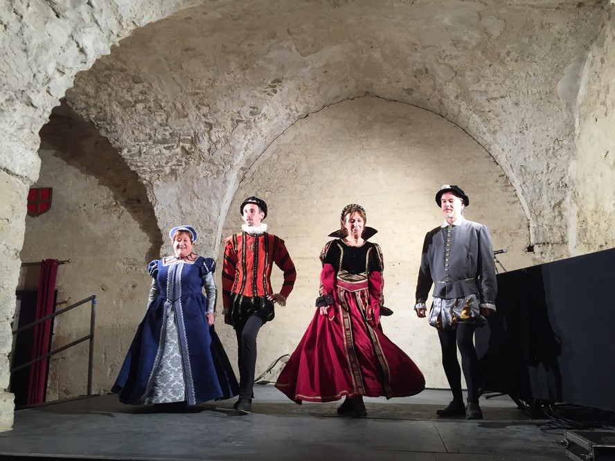 Après une dégustation oenologique des vins du domaine et le concert de musique ancienne donné dans l’intimité de ce qui reste de la demeure seigneuriale, les Pennons ont accueillis les convives de leurs bannières colorées. Puis le banquet, qui mettait à l’honneur des accords de mets et de saveurs du temps jadis, fut animé par les danseuses et les danseurs du Pennonage Baraban, enchaînant pavanes et branles Renaissance pour le plus grand plaisir de la centaine de convives réunis pour l’occasion.