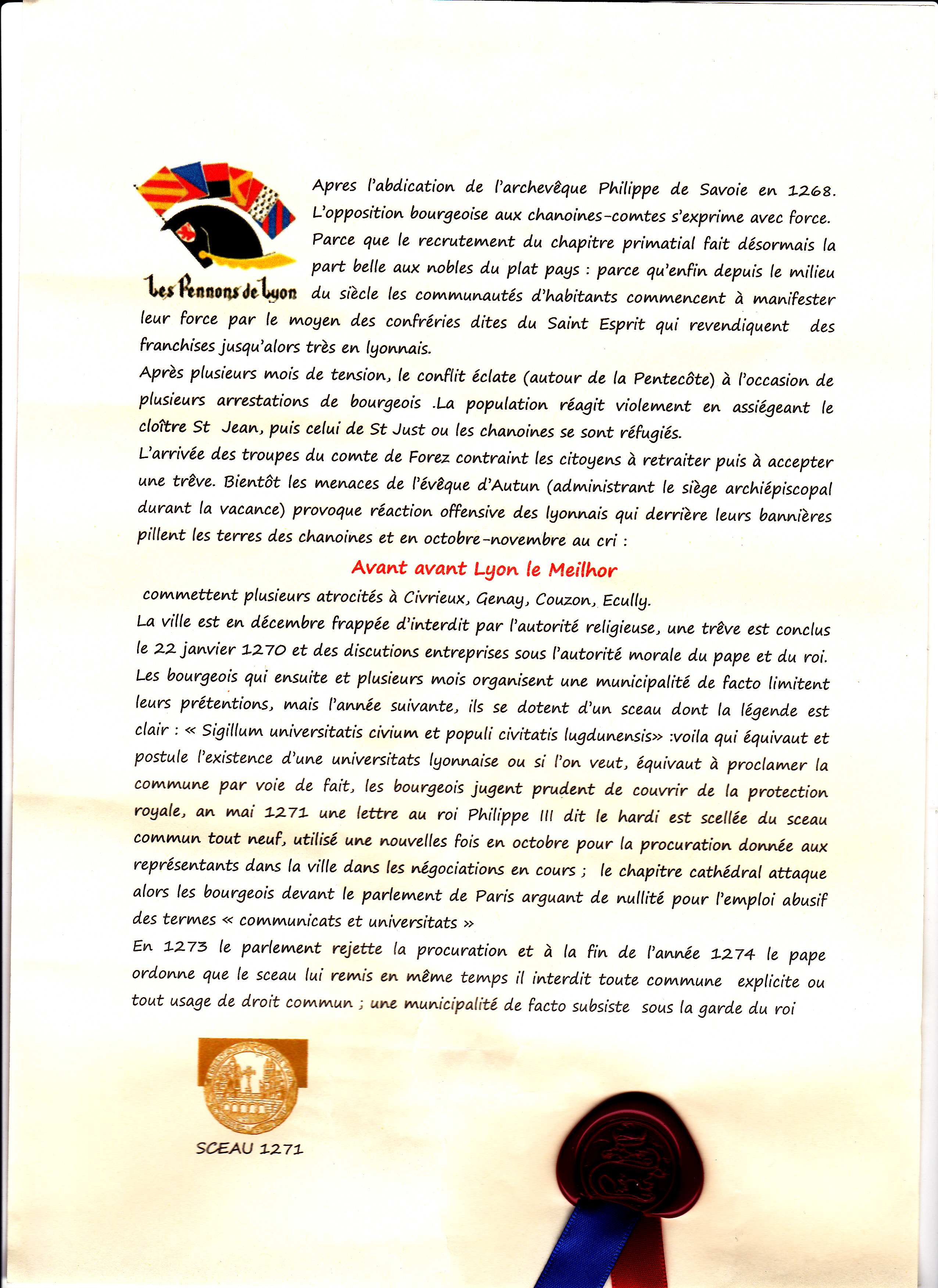 Rappel : « A l’issue de la signature de la Charte Sapaudine de 1320, la ville de Lyon obtient sa liberté communale. 50 ans plus tôt, suite à plusieurs mois de conflit entre la population , bourgeois, notables, marchands et le Chapitre (seul détenteur de la justice et qui abuse de ses pouvoirs),les Lyonnais firent les premiers pas vers leur indépendance en décidant la création du premier sceau de la ville de Lyon de 1271 »