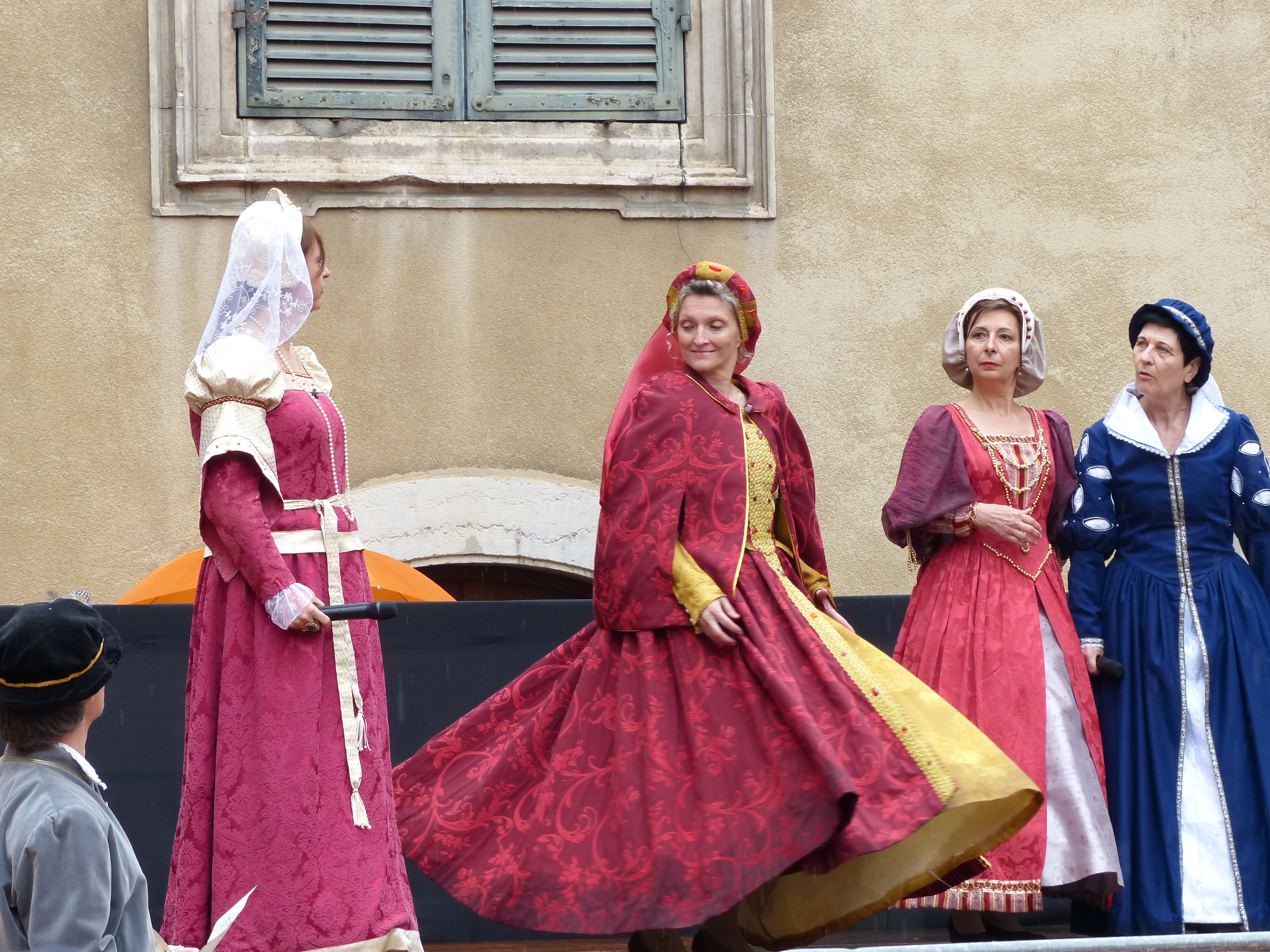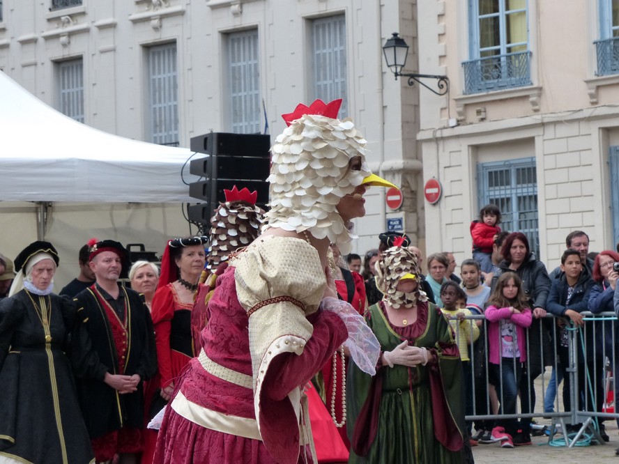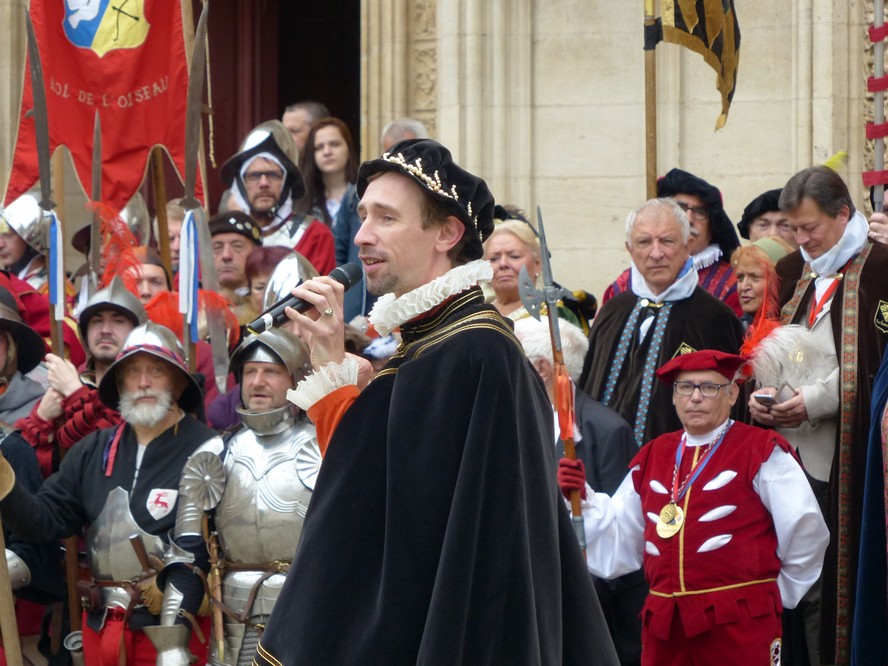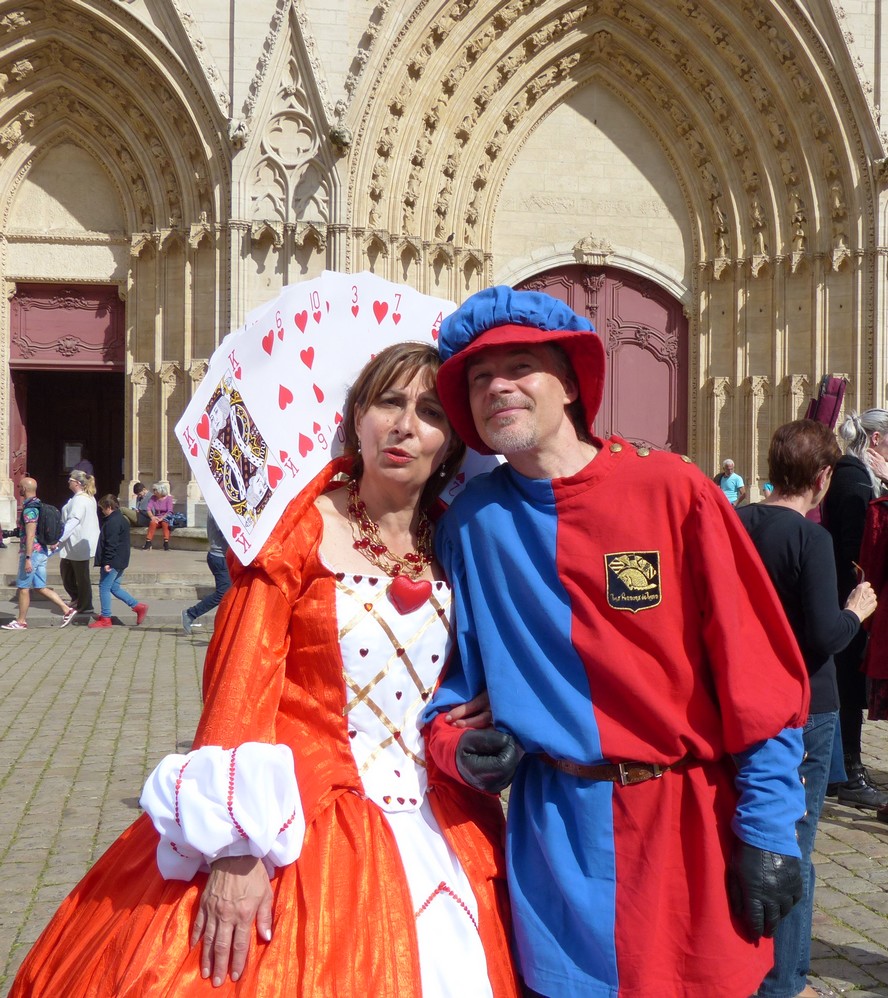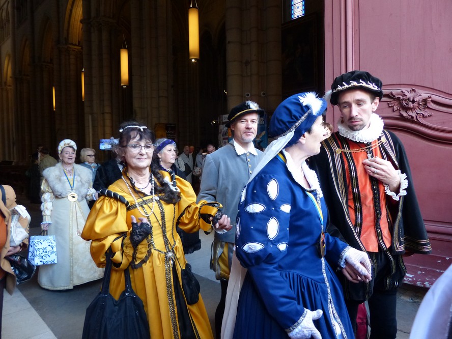 Puis en fin de journée, devant la cathédrale, notre troupe rejoignit les autres pennonages pour le spectacle anniversaire de la compagnie. « Jeux de vilains », offert à la foule innombrable, enchanta le public de ses péripéties autant qu’il l’éblouit par ses riches décors et fantasques costumes. Tel succès gravera pour longtemps dans les cœurs cet événement unique!