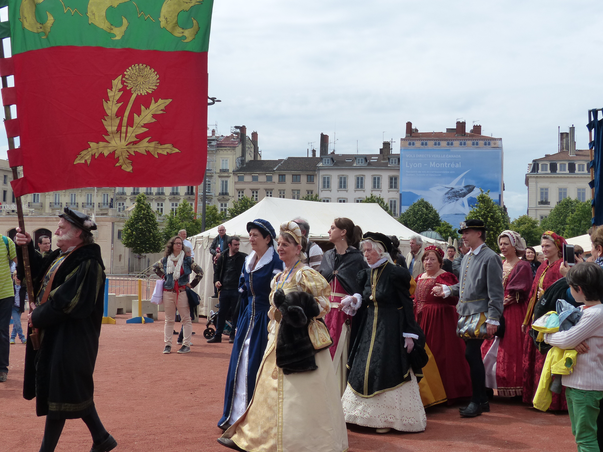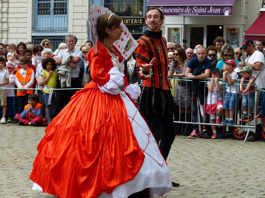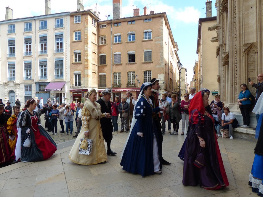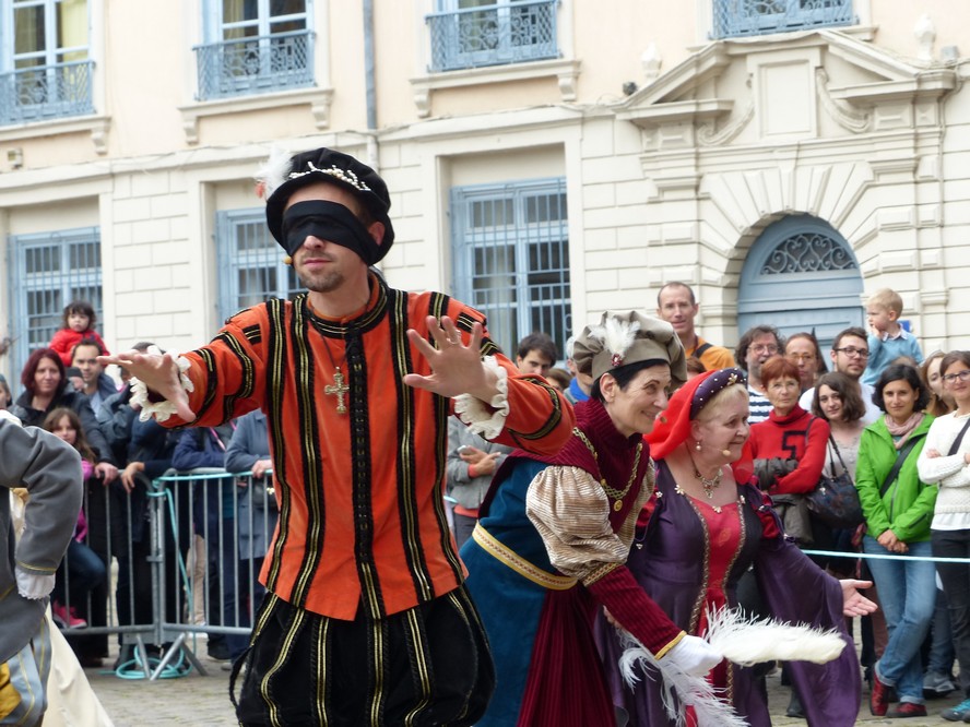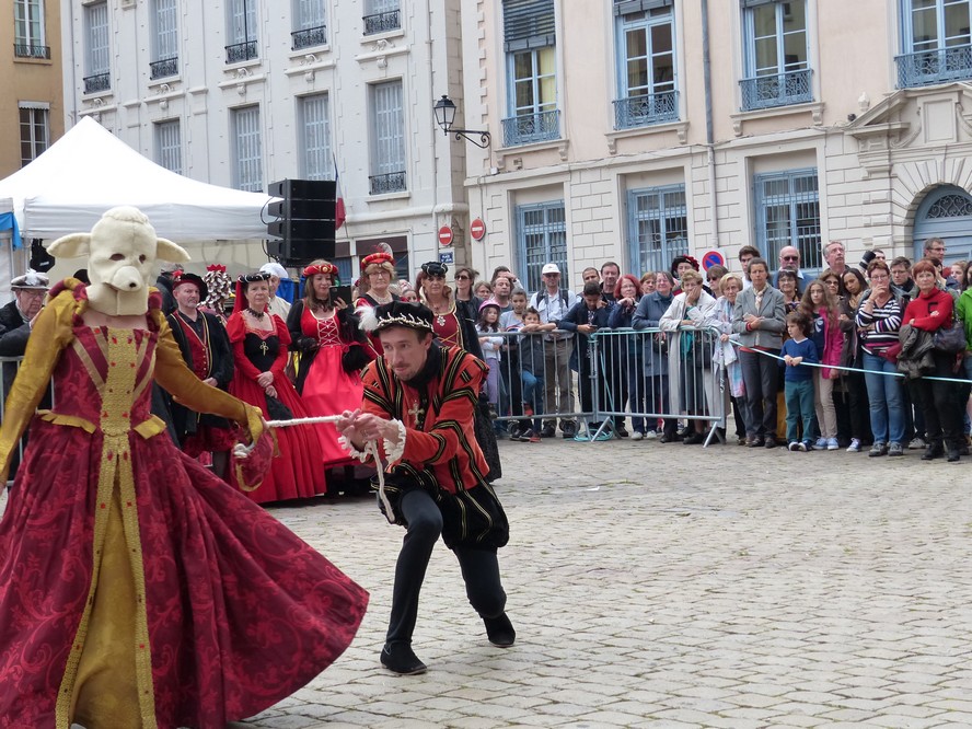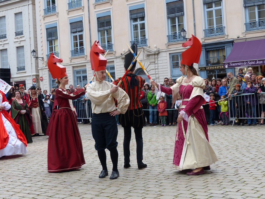 Les Pennons de Lyon célébraient cette année le trentième anniversaire de leur renaissance. Quatre jours durant ( du 11 au 14 mai ), la place Bellecour et le Vieux-Lyon résonnèrent aux sons des tambours et des vielles. Vifs lanceurs de drapeaux, facétieux saltimbanques, farouches guerroyeurs, habiles escrimeurs, gais musiciens, fringants danseurs égayèrent la ville de leurs mille talents. En si faste occasion, les pennons Baraban eurent l’immense plaisir de présenter cinq fois leur dernière saynète, « Laissées pour contes », dont la riante intrigue séduit grands et petits.