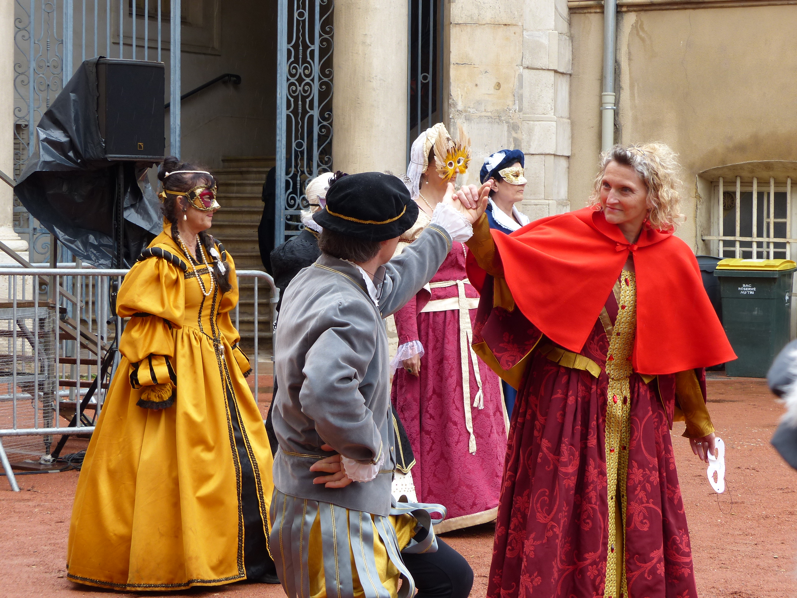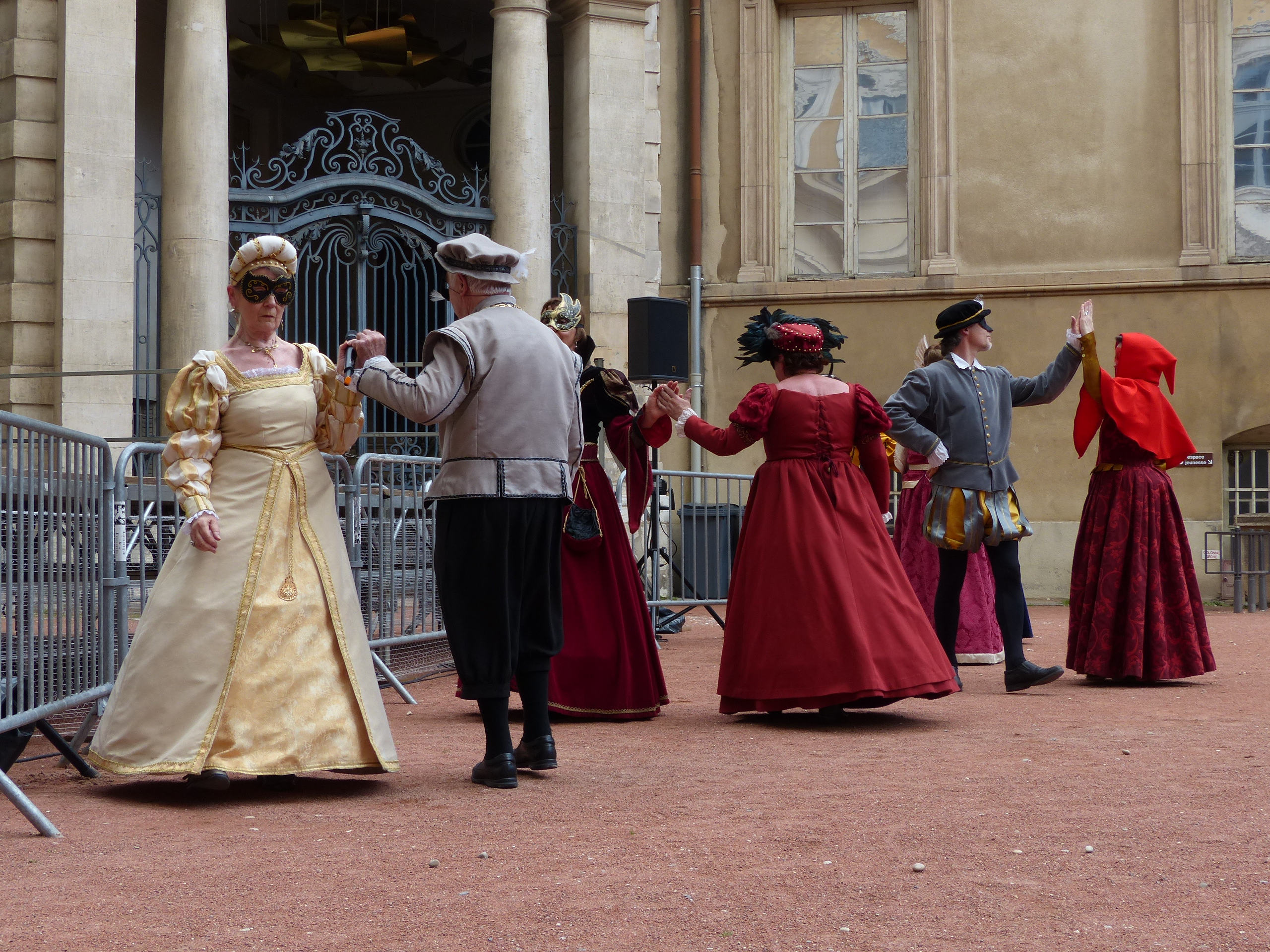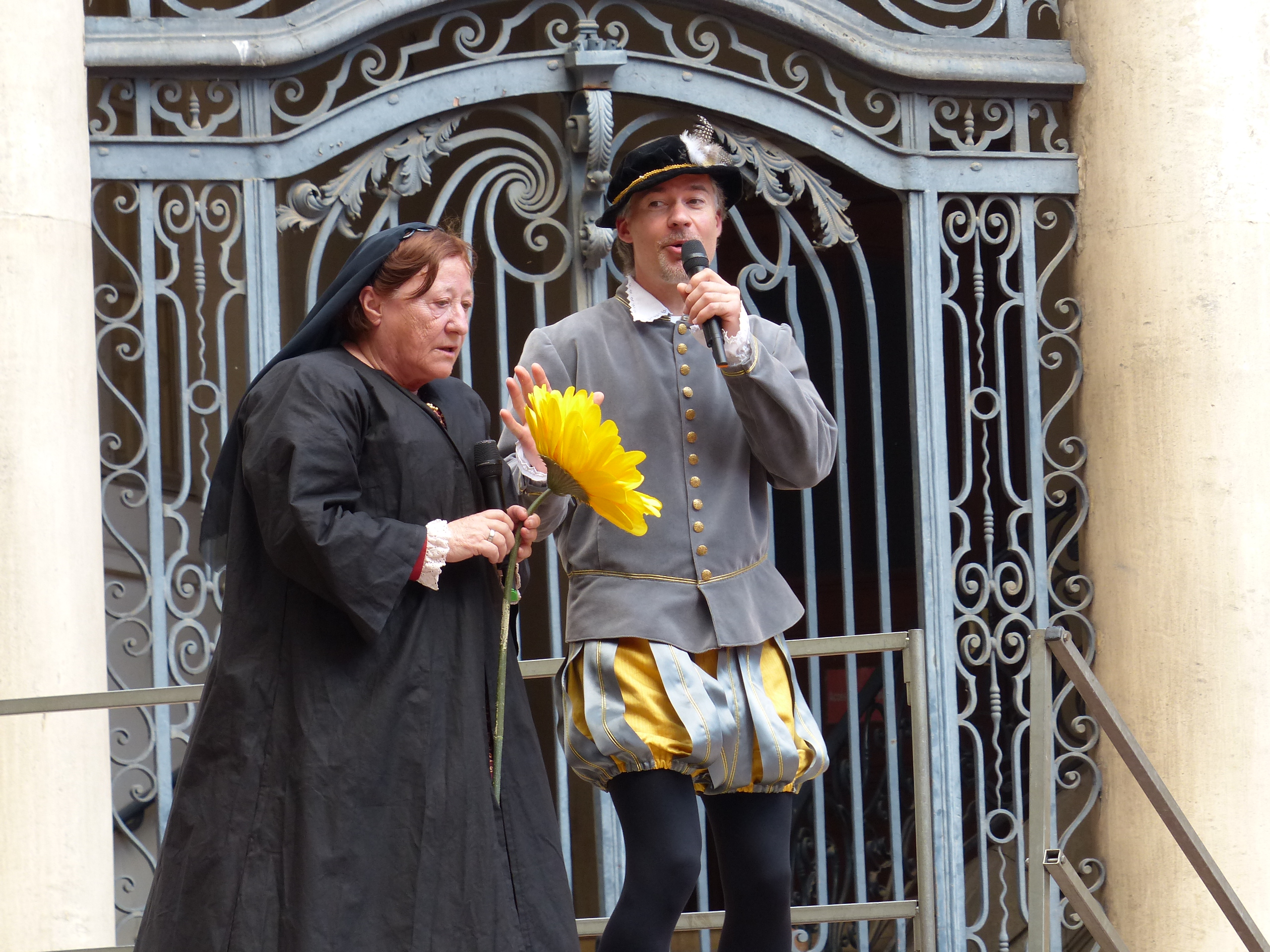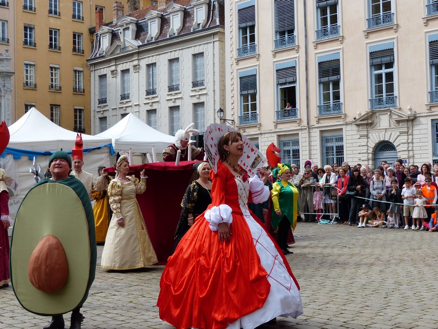 Les Pennons de Lyon célébraient cette année le trentième anniversaire de leur renaissance. Quatre jours durant ( du 11 au 14 mai ), la place Bellecour et le Vieux-Lyon résonnèrent aux sons des tambours et des vielles. Vifs lanceurs de drapeaux, facétieux saltimbanques, farouches guerroyeurs, habiles escrimeurs, gais musiciens, fringants danseurs égayèrent la ville de leurs mille talents. En si faste occasion, les pennons Baraban eurent l’immense plaisir de présenter cinq fois leur dernière saynète, « Laissées pour contes », dont la riante intrigue séduit grands et petits.
