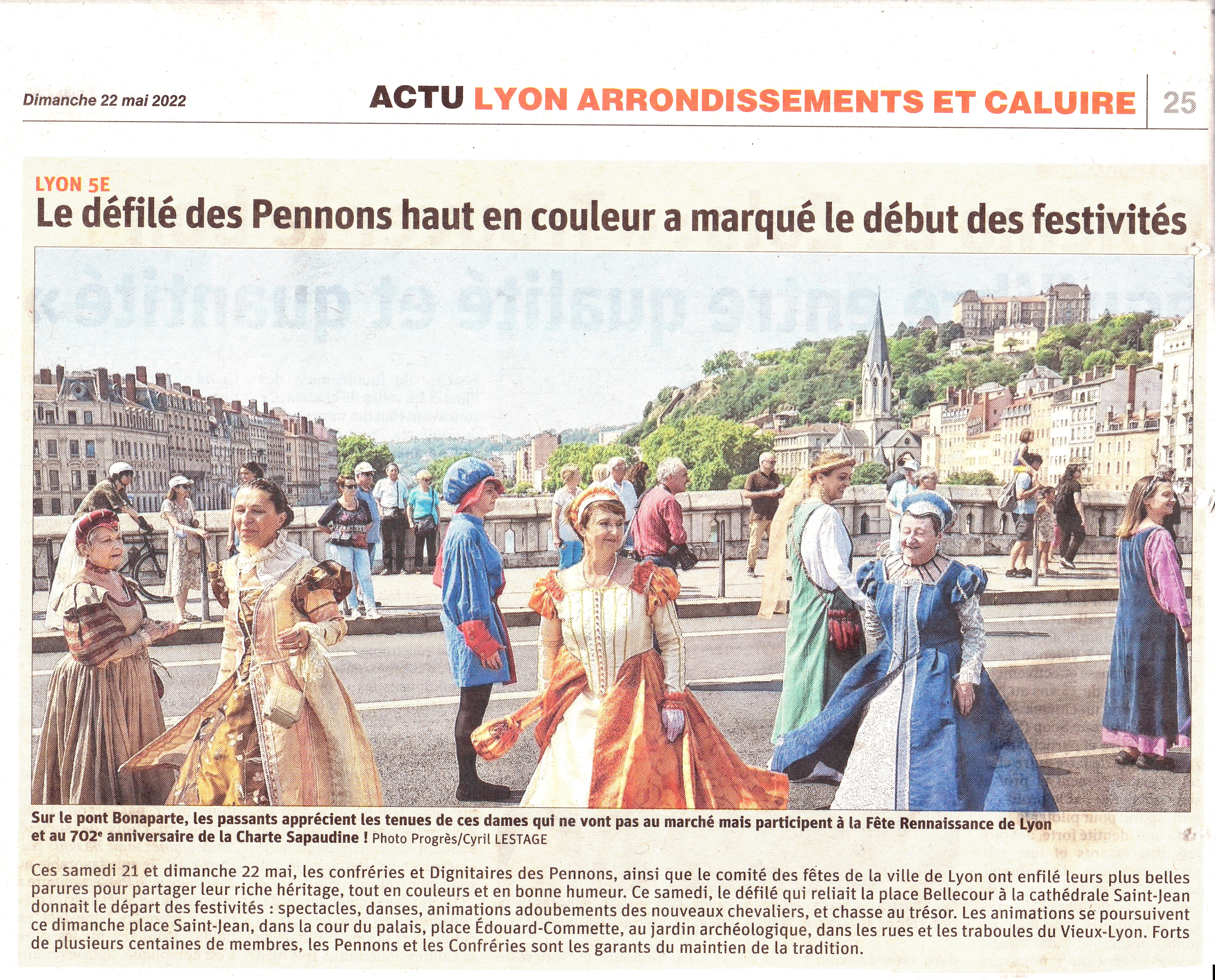 « Déjouant les prédictions les plus humides, c’est une atmosphère estivale qui berça ce week-end la traditionnelle fête Renaissance de Lyon. Les solaires ardeurs le disputaient en effet à la chaleur d’un public enflammé, ébloui par les acrobaties des troupes saltimbanques, la virtuosité d’habiles musiciens, les prouesses enhardies de vaillants escrimeurs, les ballets raffinés de gracieux danseurs. Inégalables fleurons de tant d’animations, les Pennons Baraban émerveillèrent petits et grands de leurs « Incroyables talents », ensuite distillés en une trépidante autant que somptueuse fresque d’histoire lyonnaise, couronnement sublime à ces festivités! »