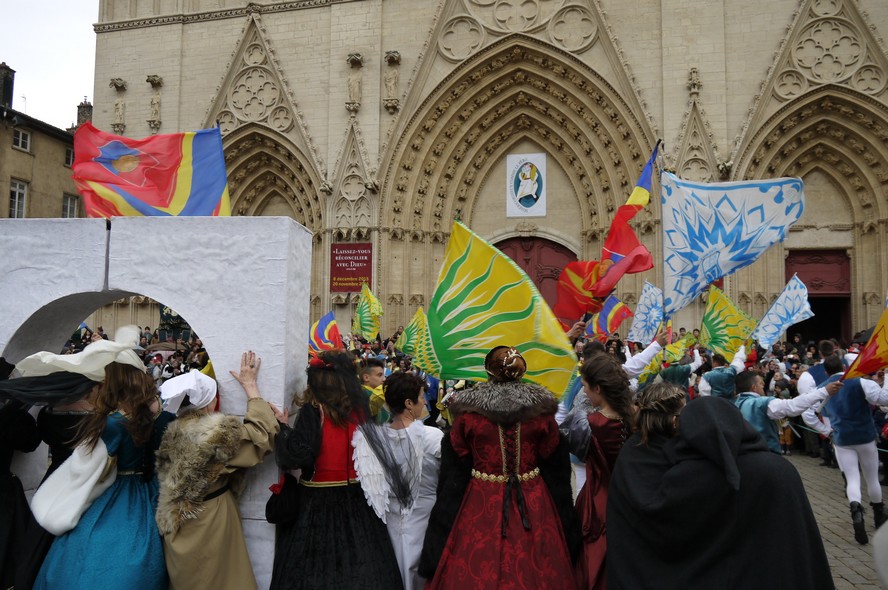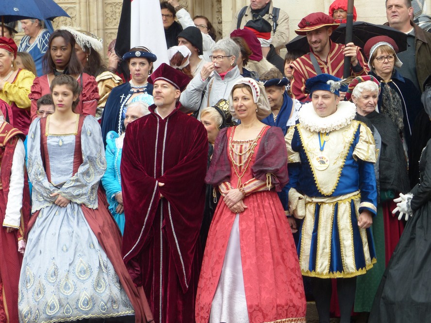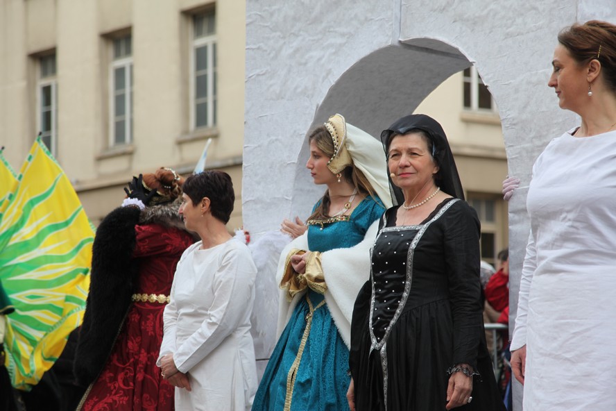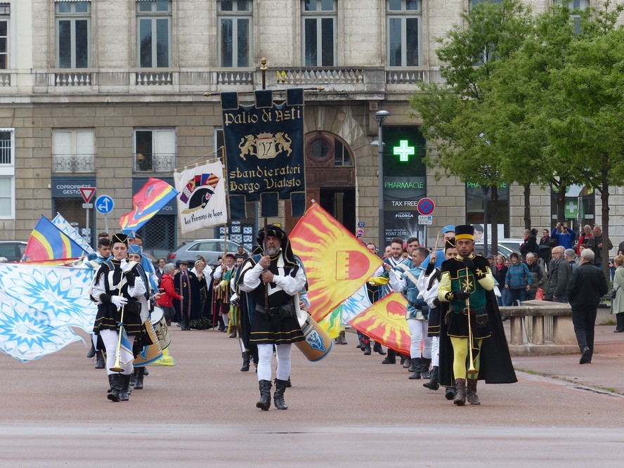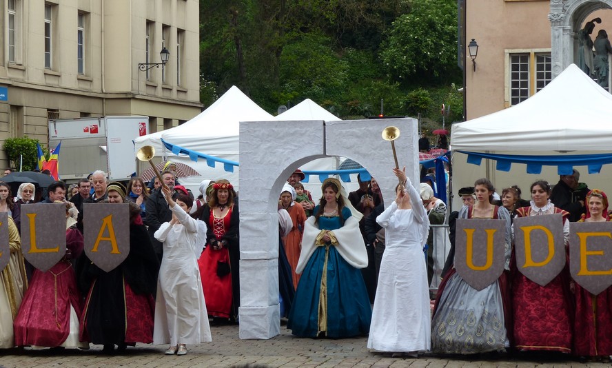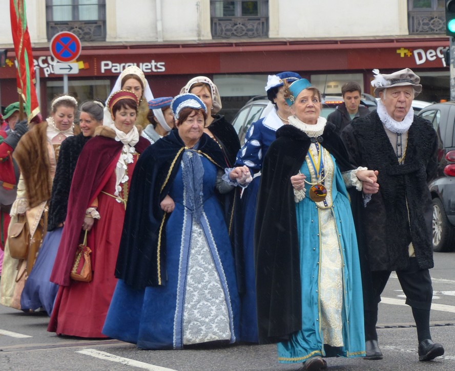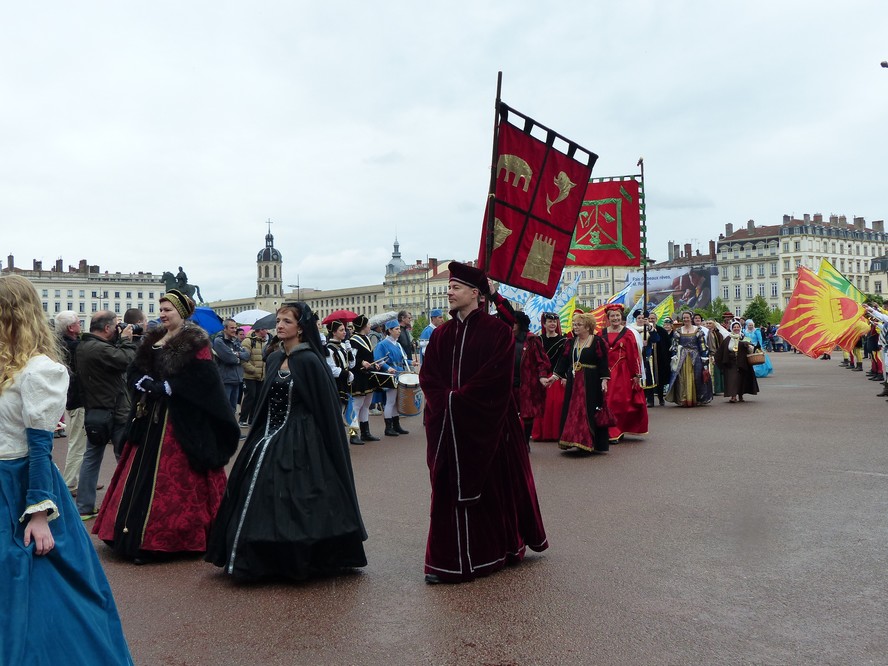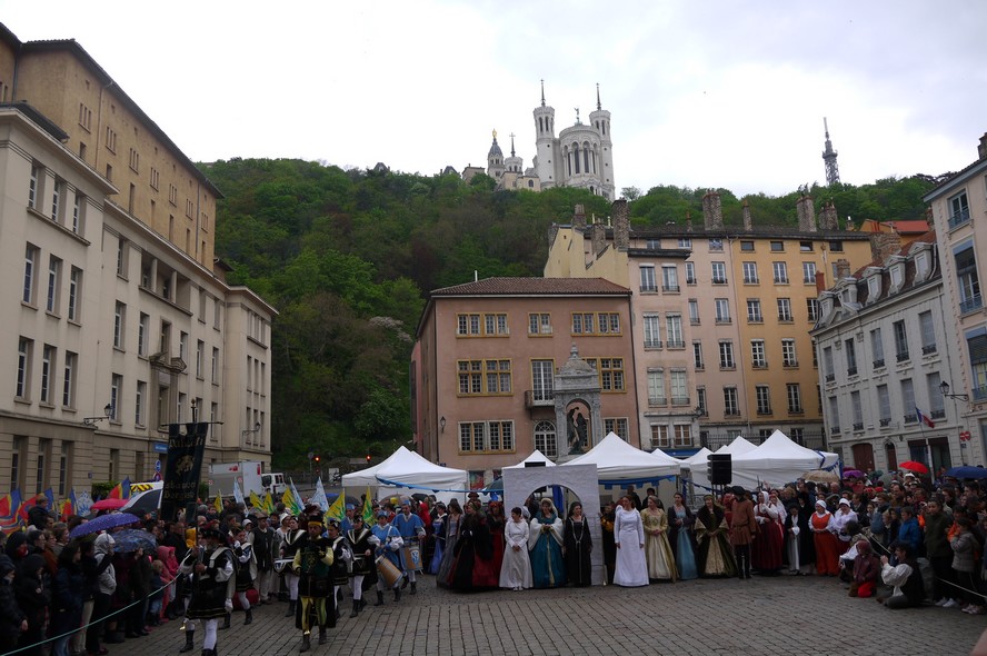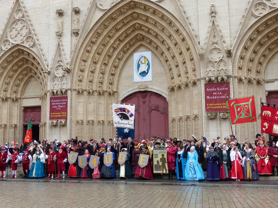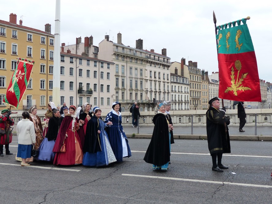 « En ce 23 avril, malgré le temps maussade, les gaillards pennons Baraban accueillirent chaleureusement la reine Claude de France, à l’occasion du 500 ème anniversaire de sa première entrée. Dès 11 h, un chatoyant défilé, unissant tous les participants à la fête, accompagna la souveraine de la place Bellecour à la cathédrale St-Jean »