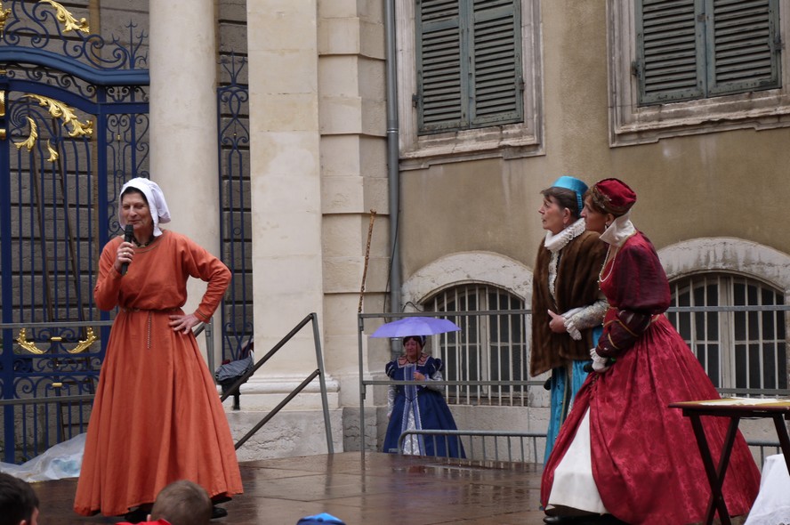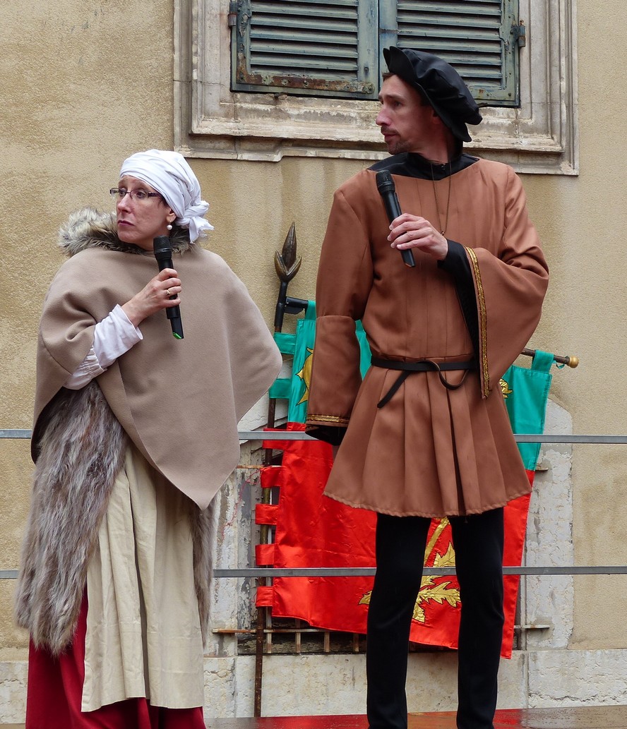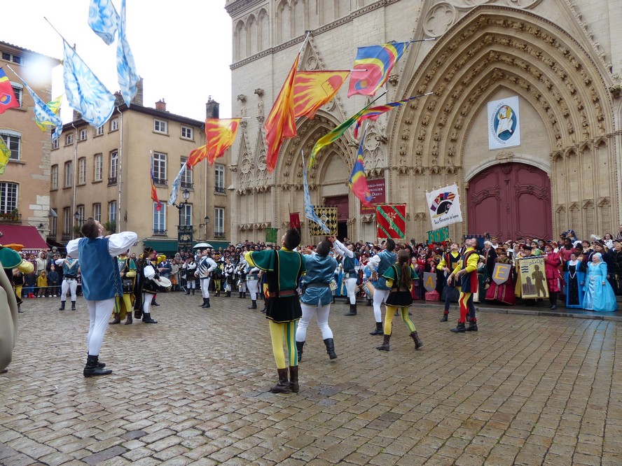 « L’après-midi, le quartier du vieux-Lyon retrouva un instant tout le lustre et l’éclat d’une fête Renaissance: baladins, jongleurs, musiciens et danseurs enchantèrent tour à tour la foule des visiteurs. En cette heureuse occasion, le pennonage Baraban égaya petits et grands d’une farce joyeuse: