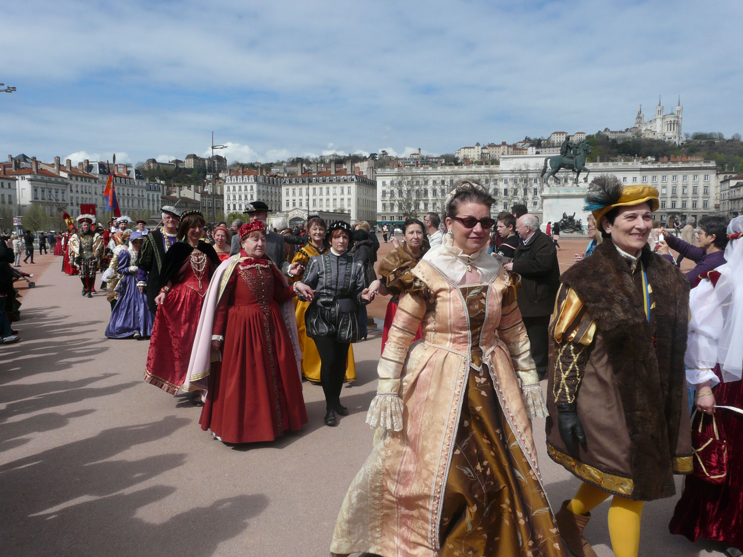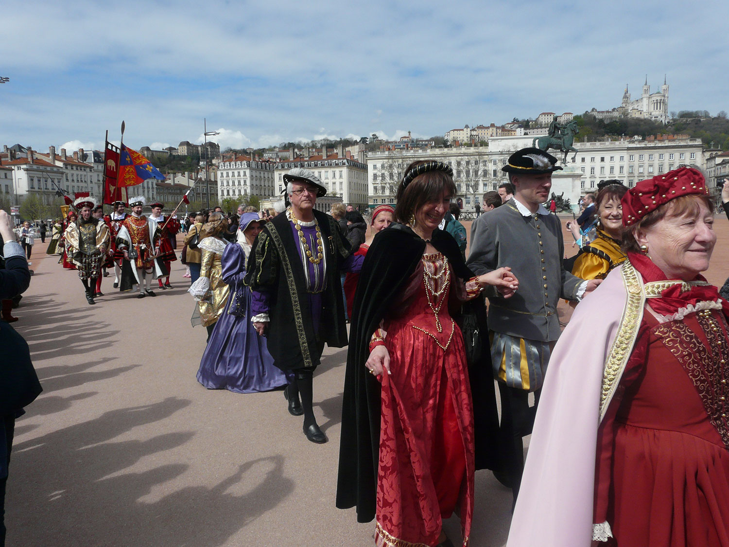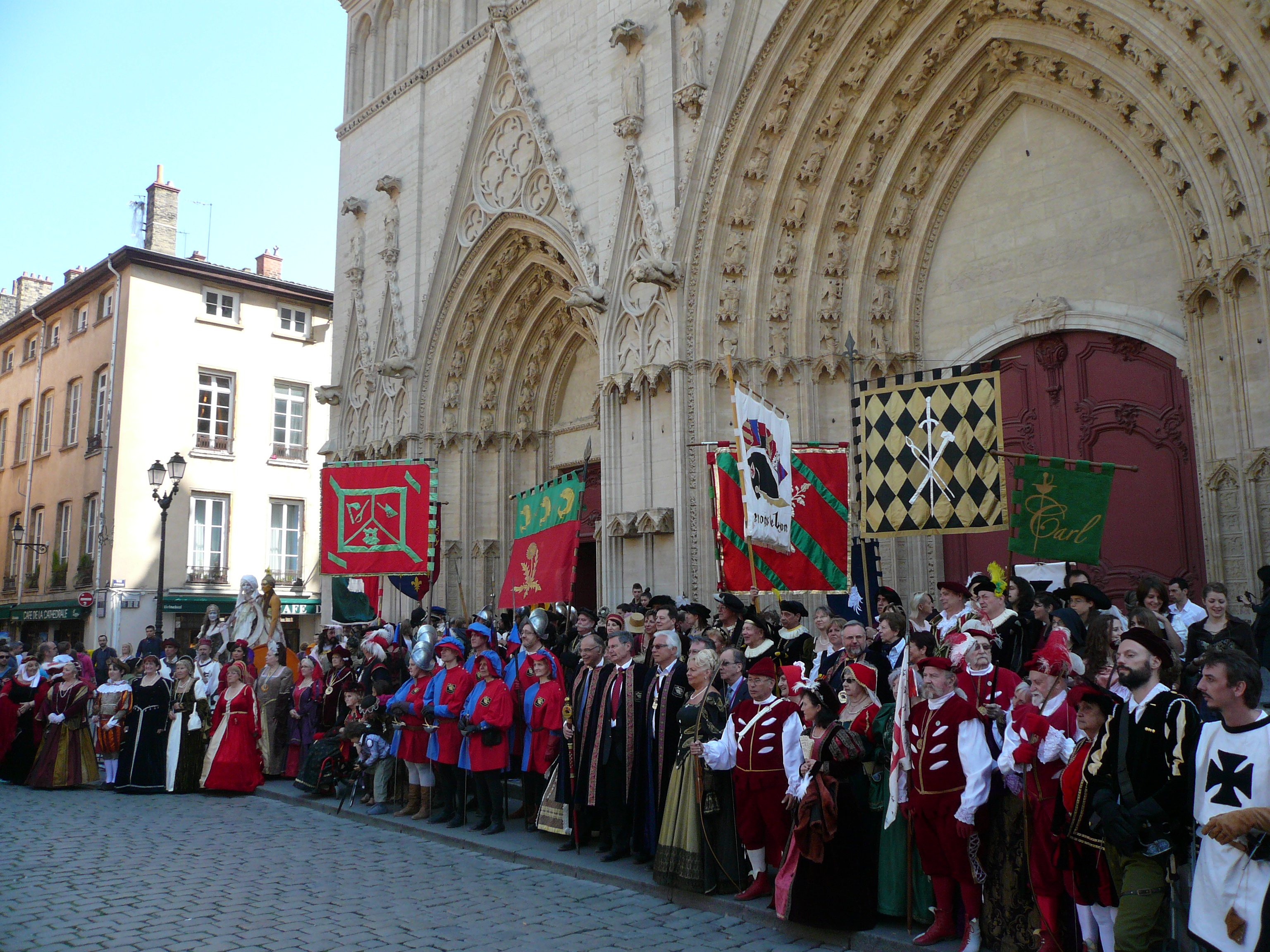 Grand défilé des Pennons de Lyon de la place Bellecour à la place St Jean. Les Pennons de Lyon défilent accompagnés de leur bannière.